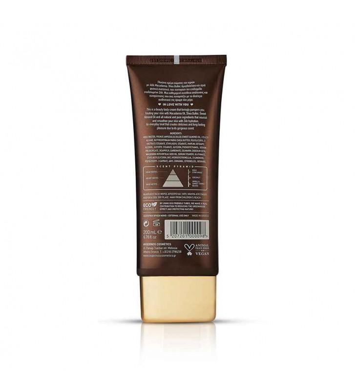 Πλούσια κρέμα για τα χέρια και το σώμα με έλαια macadamia ,αμυγδάλου και βούτυρο karité (shea butter) για πλούσια ενυδατική δράση που αποτρέπει την απώλεια υγρασίας χωρίς να λιπαίνει την επιδερμίδα και απορροφάται άμεσα. Ενισχυμένη με το Avra, ένα απολαυστικό και αισθησιακό άρωμα με νότες από βανίλιες και εξωτικά φρούτα..