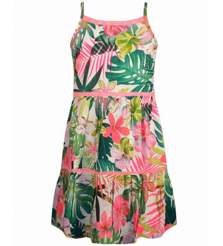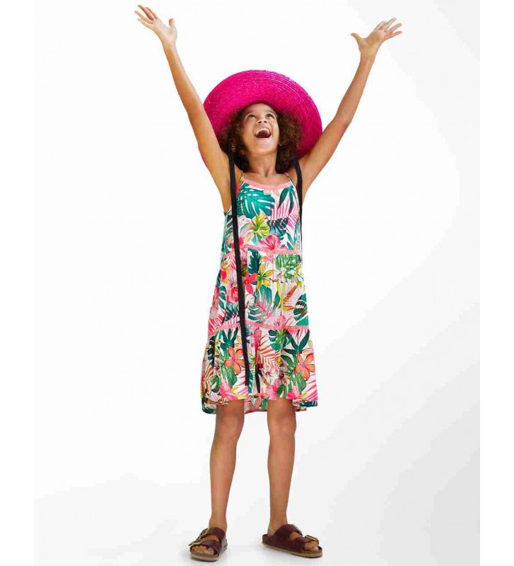 Φόρεμα βισκόζ εμπριμέ φλοράλ, με τιράντες λεπτές. Οι τιράντες διαθέτουν αυξομειωτή. Κάτω από το στήθος υπάρχει σούρα και στο κάτω μέρος υπάρχουν 2 λωρίδες από δαντέλα.