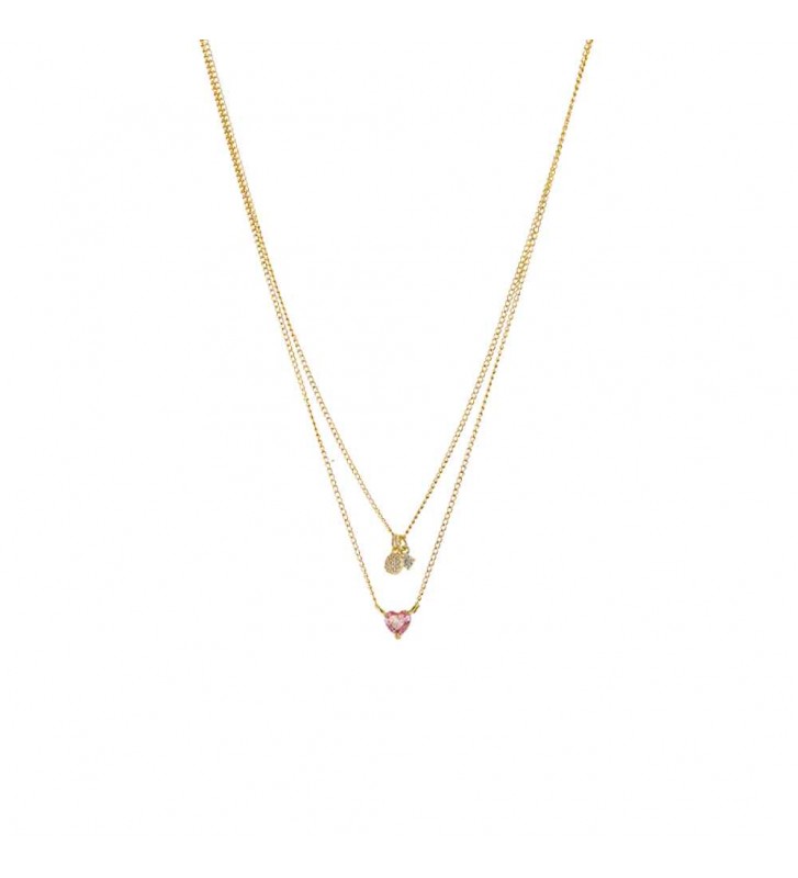 01L15-02185 Loisir Κολιέ Happy Hearts μεταλλικό επίχρυσο διπλό με ροζ καρδιά και ζιργκόν