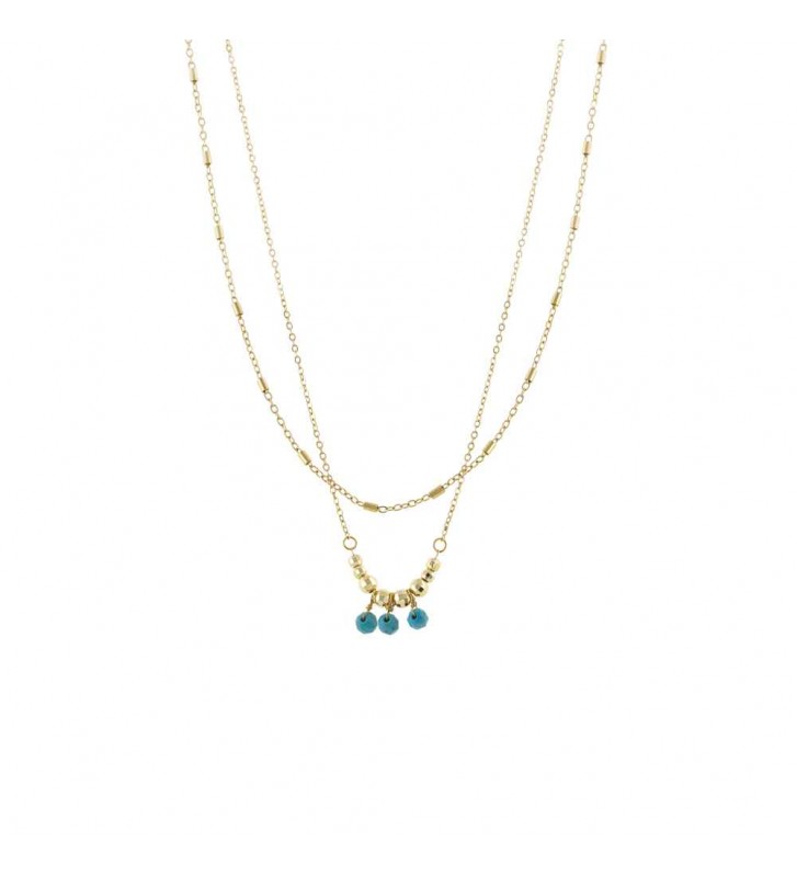 01L27-00867 Loisir Κολιέ Charming ατσάλινο επίχρυσο διπλό με τιρκουάζ χάντρες και σφαίρες
