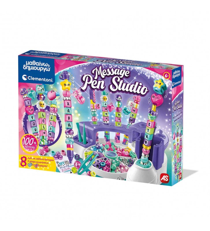 Ένα studio που τα στυλό που φτιάχνεις έχουν τα δικά σου μηνύματα! Το Message Pen Studio είναι ένα πρωτότυπο δημιουργικό studio που δίνει στα παιδιά τη δυνατότητα να σχεδιάζουν και να δημιουργούν μοναδικά στυλό με προσωπικά μηνύματα. Με γράμματα στα ελληνικά και αγγλικά, αμέτρητα αξεσουάρ και έξυπνα εργαλεία, η δημιουργία δεν έχει όρια! Το σετ περιλαμβάνει πάνω από 100 αξεσουάρ, δημιουργική βάση εργασίας και 8 μελάνια σε διαφορετικά χρώματα, ώστε κάθε στυλό να είναι διαφορετικό.