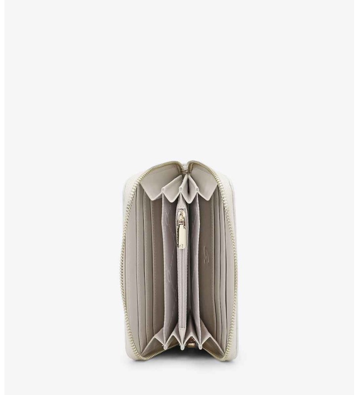 Γυναικείο πορτοφόλι Tiril, κατασκευασμένο από τεχνόδερμα με ξεχωριστή καπιτονέ όψη. Εσωτερικά είναι φοδραρισμένο και περιέχει μία θήκη φερμουάρ, πολλαπλές θέσεις για κάρτες, όπως και θέσεις για χαρτονομίσματα. Ασφαλίζει με φερμουάρ και διαθέτει επιπλέον αποσπώμενο λουράκι καρπού για να μπορεί να κρατηθεί και στο χέρι.