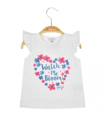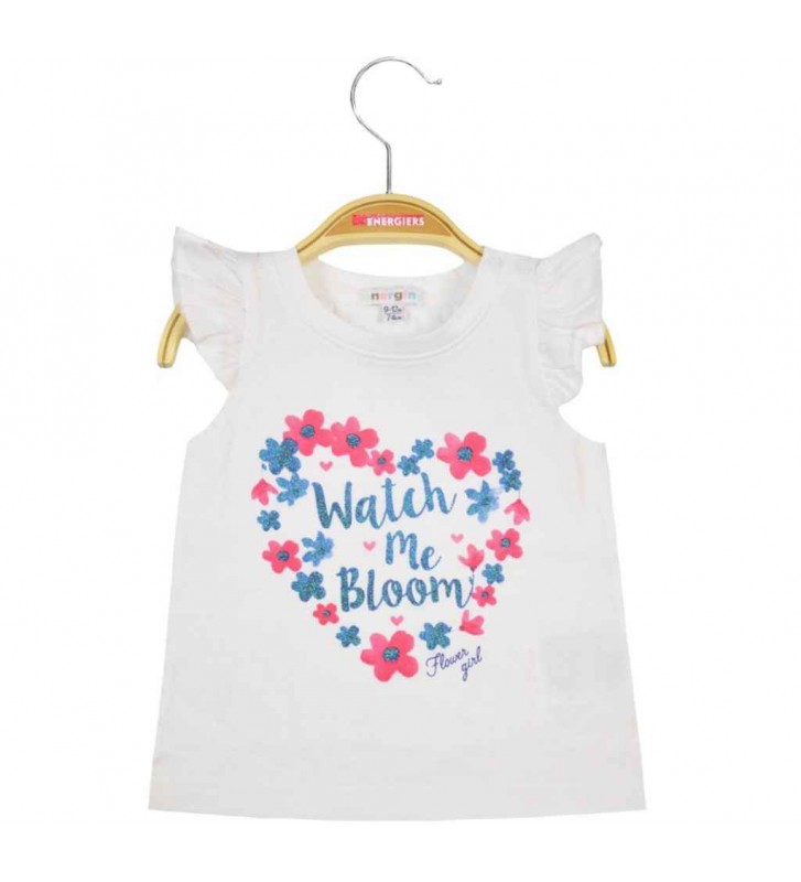 Μπλούζα αμάνικη με τύπωμα καρδιά από λουλούδια, βολάν και κόπιτσες στον ώμο, σε λευκό χρώμα.
