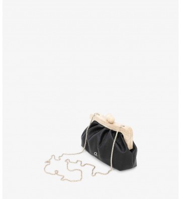 Βραδινό τσαντάκι Pieta, με ιδιαίτερη γυαλιστερή όψη. Είναι κατασκευασμένο από τεχνόδερμα υψηλής ποιότητας, με χρυσή αποσπώμενη αλυσίδα για να φορεθεί και ως χιαστί. Είναι πλαισιωμένο από μεταλλικό χρυσό πλαίσιο και κλιπ ασφαλείας. Εσωτερικά αποτελείται από μία θήκη με ύφασμα. Ένα πολύ ιδιαίτερο τσαντάκι ιδανικό για κάθε βραδινή εμφανίση.