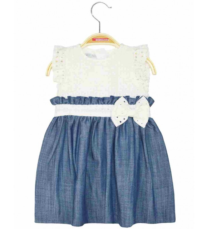 Φόρεμα δίχρωμο με φιόγκο στη μέση. Το επάνω μέρος είναι λευκό και έχει βαμβακερή δαντέλα και βολάν στα μανίκια. Το κάτω μέρος είναι τζην. Στη μέση υπάρχει ζώνη από λευκή βαμβακερή δαντέλα η οποία δημιουργεί βολάν. Στο πίσω μέρος υπάρχει φερμουάρ και εσωτερικά βαμβακερή φόδρα.
