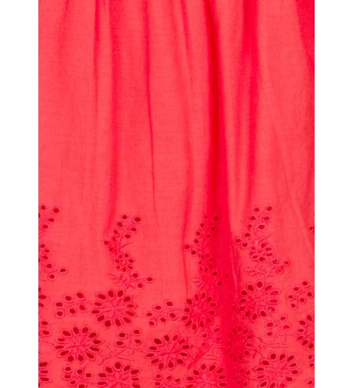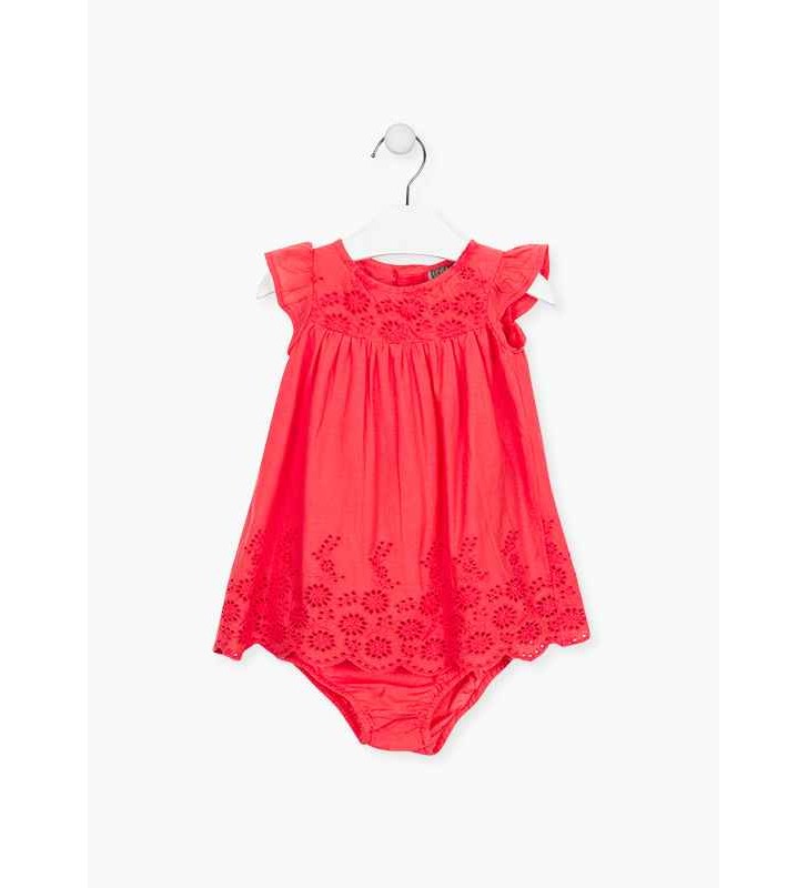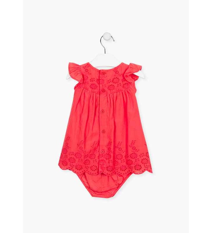Βαμβακερό φόρεμα με κεντημένο στρίφωμα για νεογέννητο κορίτσι. Κοντό μανίκι με βολάν. Πίσω μέσω κουμπιού. Επένδυση με ελαστική ζώνη μέσης και επένδυση στα πόδια.