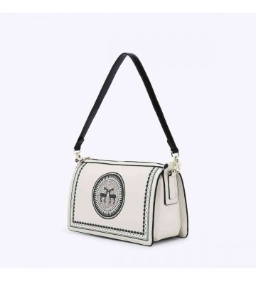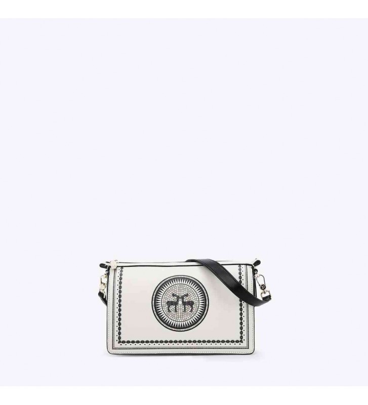 Γυναικεία τσάντα ώμου με τύπωμα από ελάφι και διπλά χερούλια, σε οβάλ σχήμα από τεχνόδερμα. Εσωτερικά είναι επενδυμένη με φόδρα και περιέχει θήκες και τσέπη που κλείνει. Ασφαλίζεται με μαγνητικό κούμπωμα. Μία από τις καλύτερες τσάντες της φετινής συλλογής μας.