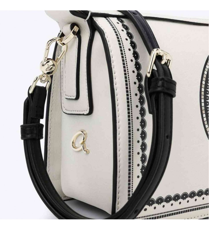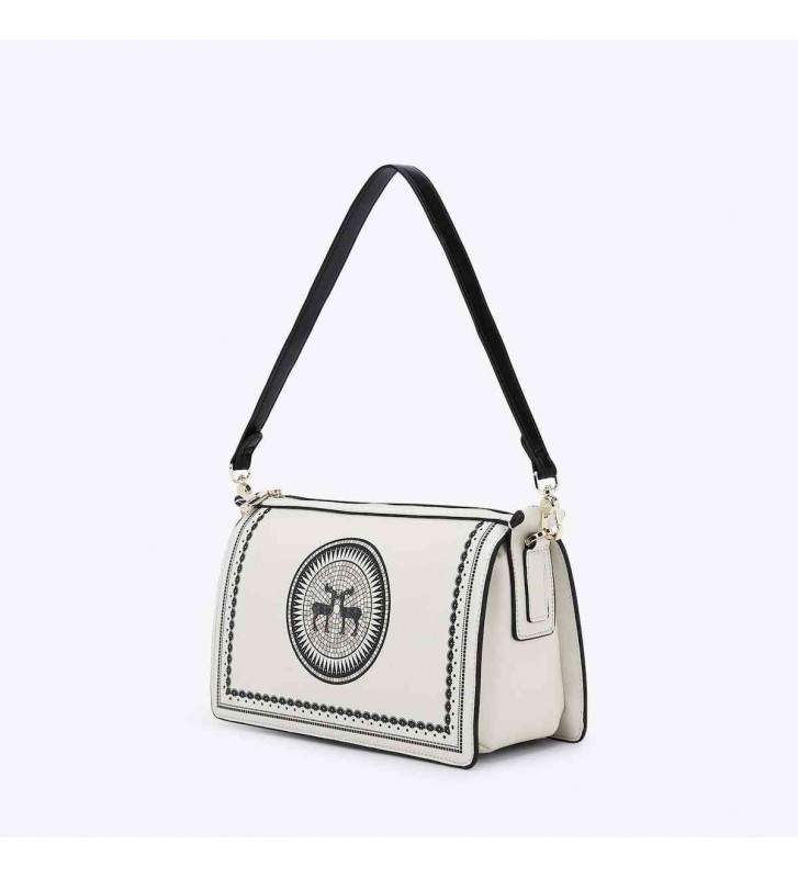 Γυναικεία τσάντα ώμου με φλοράλ τύπωμα, από συνθετικό δέρμα. Διαθέτει ρυθμιζόμενη αλυσίδα και εσωτερικά περιέχει μία κεντρική θέση που κλείνει και δύο ανοιχτές. Ασφαλίζεται με καπάκι και κούμπωμα.